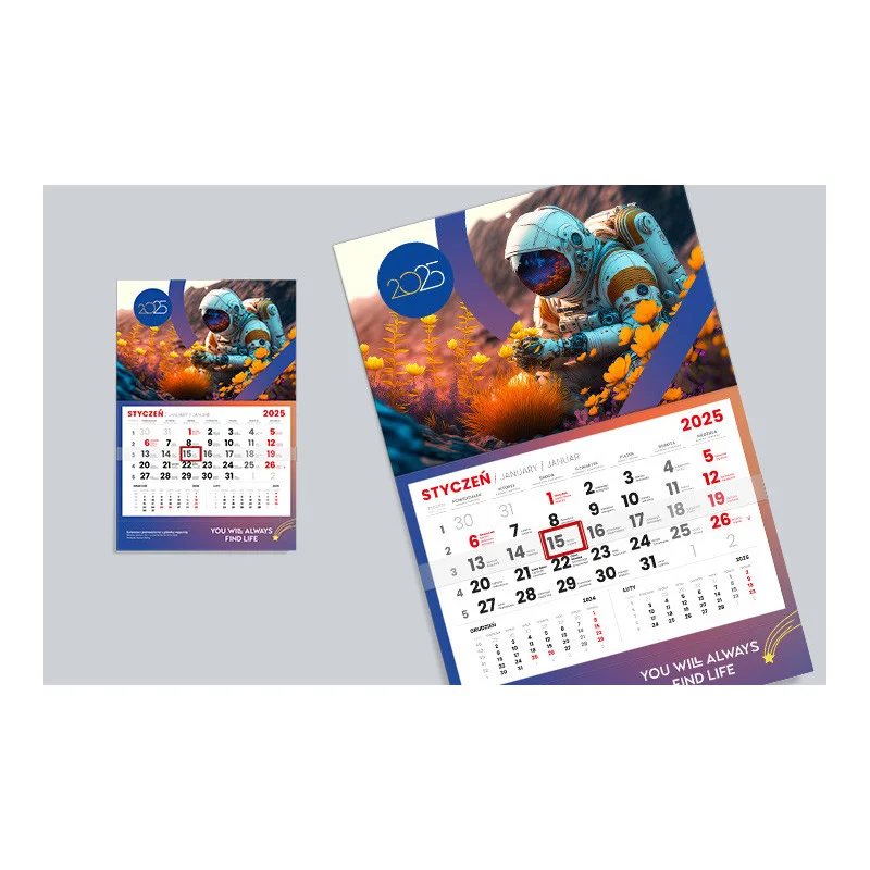 W kalendarzu zaznaczone są święta, dni wolne od pracy, niedziele handlowe oraz imieniny - w języku polskim, angielskim i niemieckim. Miesiące zaś podzielone są na poszczególne tygodnie. Każda karta prócz dni właściwego miesiąca posiada również uzupełnienie poprzedniego miesiąca w kolorze szarym.